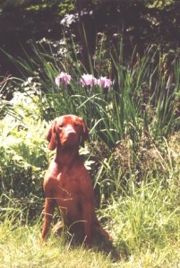 The irises grew in a swampy area in front of the great room (where the large windows and high peak are). Right now they’d be buried in snow, but they’re probably still there, underneath the frozen ground, waiting for spring.  When they bloom, though, there will be no vizsla there to sit in front of them.