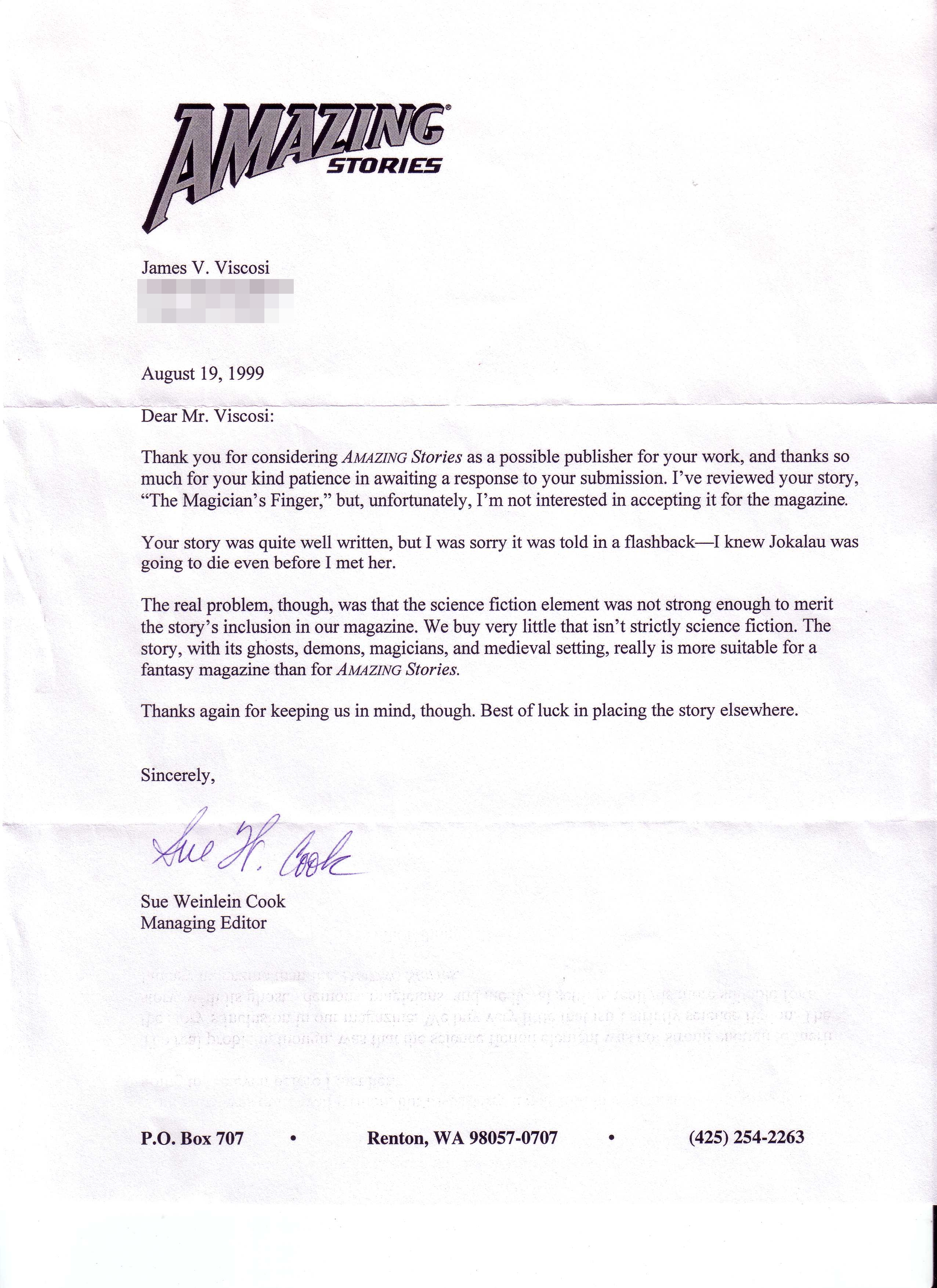 This is probably a better rejection letter than I deserved, given that I sent them something pretty far outside their target genre. They did publish some fantasy, but not very much. I’m pretty sure I picked up at least one copy of “Amazing Stories” but that’s not really enough to get a solid feel for what the editors are looking for. (On the other hand, I’m also pretty sure I have a rejection from “F&SF” for this story, too, and they have “fantasy” right in their name. Oh well.)