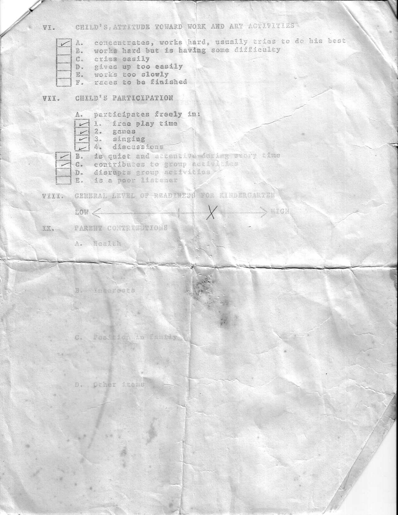 I’m not sure if this checklist considers “Tells On Other Children” to be a good thing or a bad thing.  And “Participates Freely in Singing”?  I find that hard to believe!