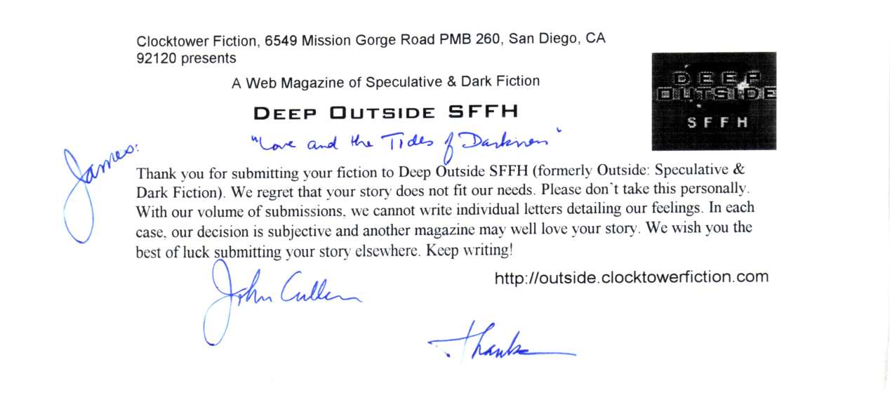 Today I reached into my massive pile of rejections and pulled out a relatively boring one from Clocktower Fiction’s webzine. This one was for “Love and the Tides of Darkness”, a short story that I originally wrote specifically for an anthology called On The Eighth Day. I really liked this story and tried to sell it to a bunch of different markets, but once the year 2000 rolled around, it was pretty much obsolete.