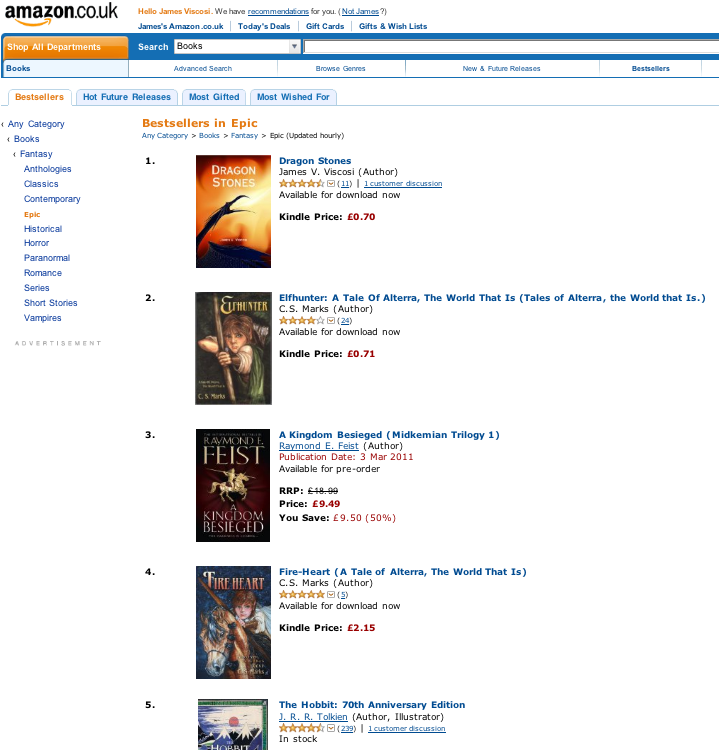Having Dragon Stones in the #2 spot was what finally got me off my duff to finish Shards, but for the past week or so C.S. Marks, Raymond E. Feist, and I have all been jockeying for #1. At the moment T’Sian the Dragon is up there, but eventually someone else will take it. Here’s hoping it’s me again. (No offense, T’Sian — love ya!)