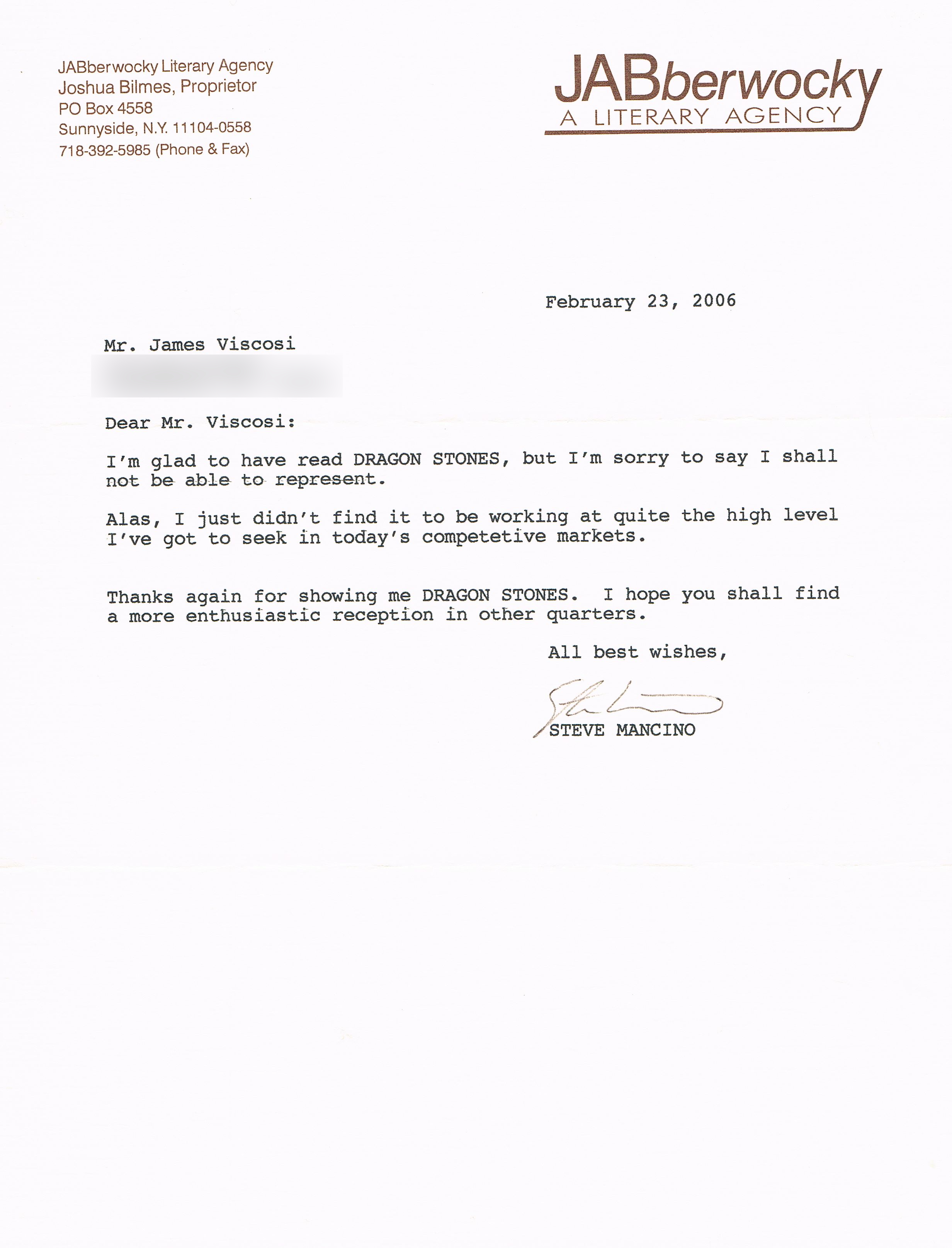 At the moment I’m between books, having finished the last one and not picked a new one yet, so there’s no Teaser Tuesday for the week. Instead I reached into my vast pile of rejection letters and pulled out this one, from The JABberwocky Agency, for a book that you may have seen mentioned here once or twice …