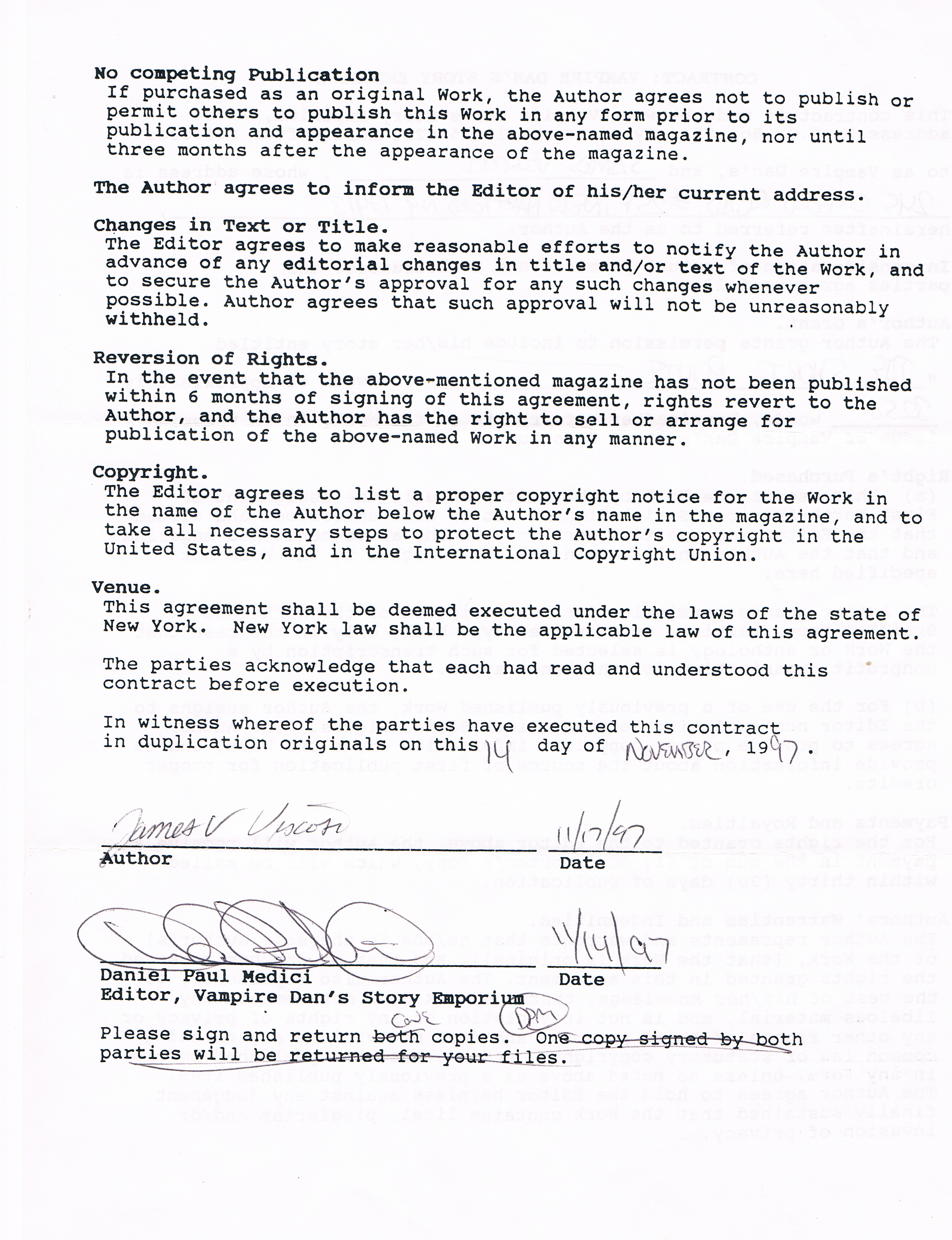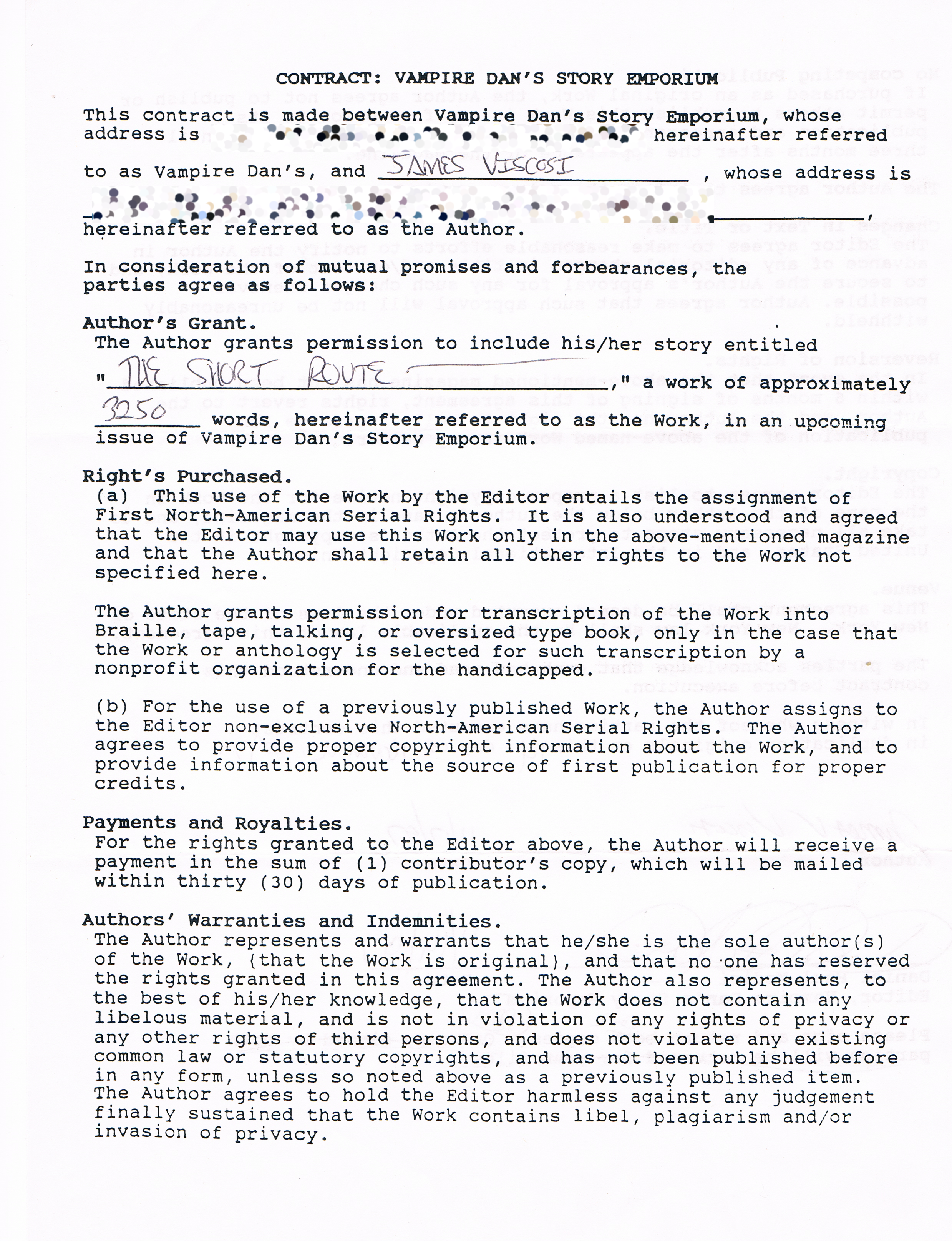 So this week I reached into my big folder full of rejections (and the occasional acceptance) and pulled out something new: A contract! Arriving as it did in November of 1997, this was, if I remember correctly, my first-ever contract, for a story called “The Short Route” (AKA “My Cousin Susan’s Favorite Story Of Mine Ever”), in which a tenderfoot from Back East discovers that there’s more than just cattle on his first cattle drive. The story appeared in “Vampire Dan’s Story Emporium” a tiny regional magazine published in Syracuse that ran from 1997 to 2001.