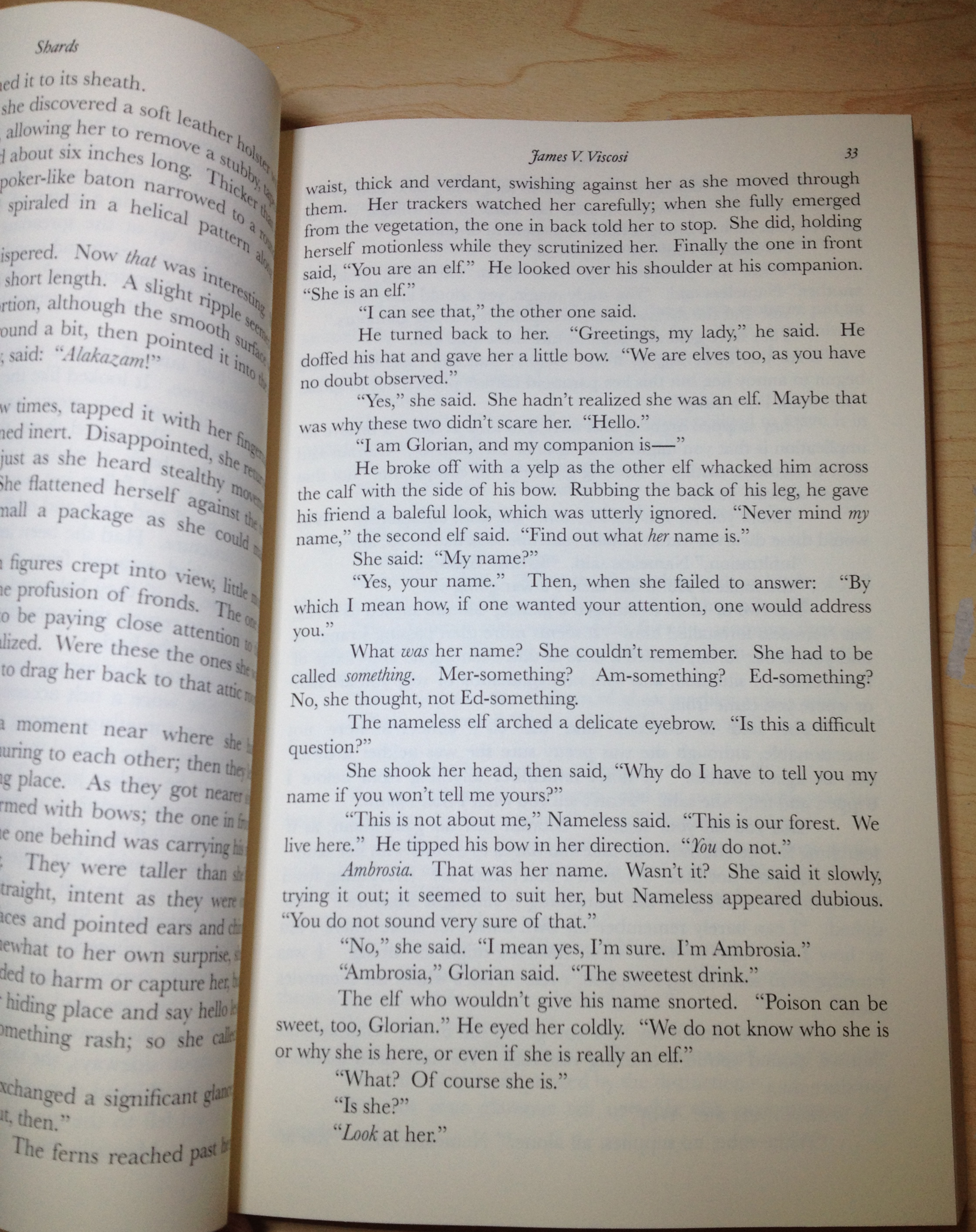 With a new font (Baskerville vs. Hoefler Text), a smaller point size, new margins, and a few other modifications, the print edition of Shards is finally (finally!) approved and in the process of going on sale via Amazon. It is already available directly from Amazon’s CreateSpace subsidiary, and for those who have an Amazon gift certificate burning a hole in their pockets (you know who you are), it should be showing up at Amazon.com within a few days.