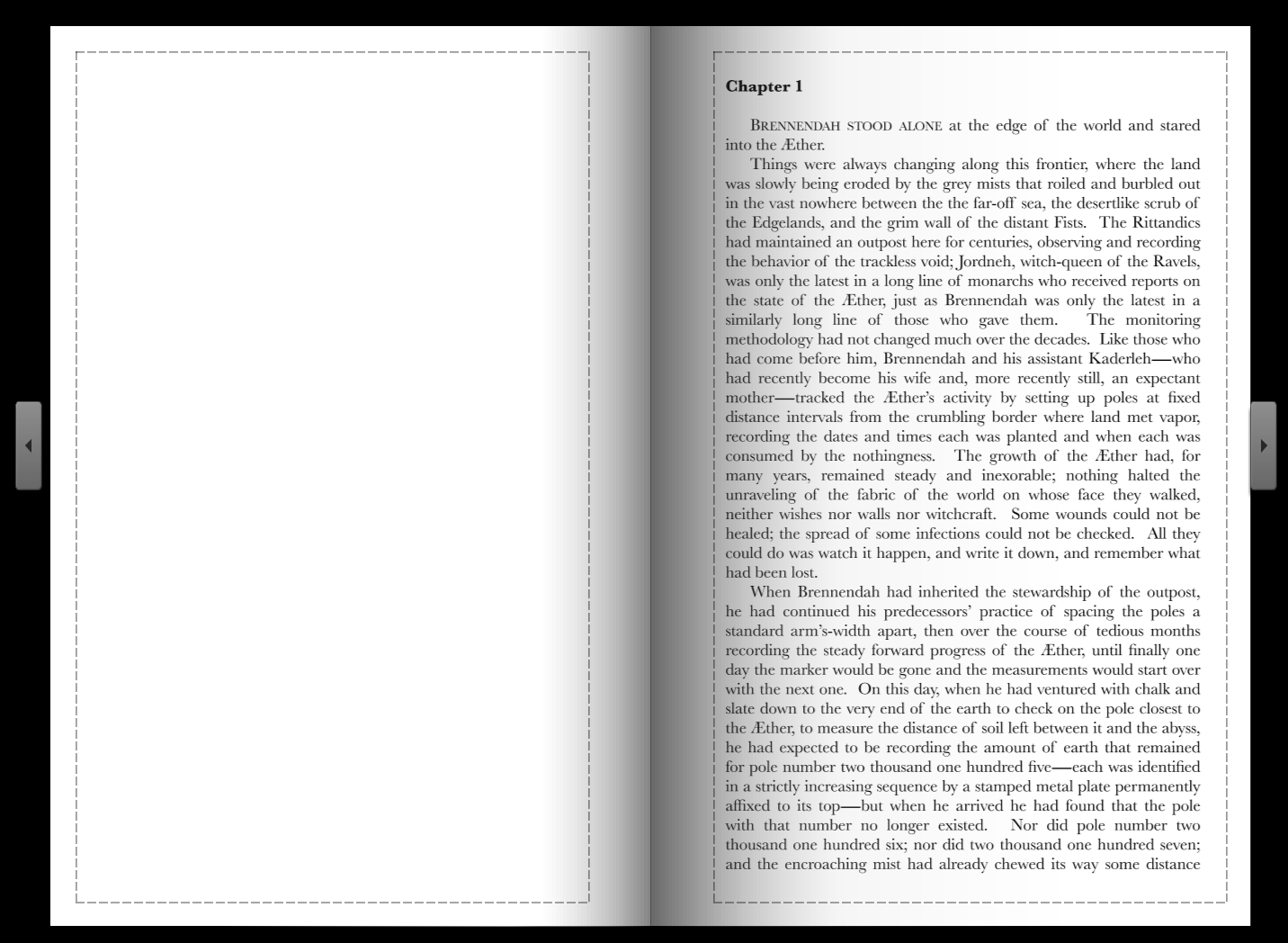 So what’s next for the never-ending “Strings” saga? Well, the Ingram edition of Shards is back in progress, now that the formatting is nailed down. Ingram will be handling all non-Amazon distribution, which means that once it’s ready, I’ll be taking down the direct-through-Nook eBook so that Ingram can replace it with theirs. And, of course, there’s the little matter of the print edition of Ravels … but that should go much faster, because — through the magic that is Scrivener — all I have to do at this point is hit the “Compile” button to get a PDF that has all the exact same formatting as Shards. In fact, I just did! Now I just have to wait for CreateSpace to finish processing it, and order a proof. Not that the “online proof” version doesn’t look good:
