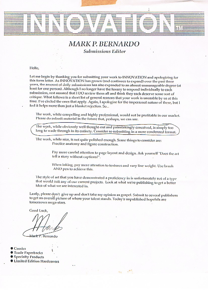 I really have no idea what material I sent to Innovation, but I would guess, given the list of rejection reasons available for the editor to circle, that it was one of my comic book proposals. The original “Night Watchman“, perhaps. “Practice anatomy and figure construction”? “When inking, pay more attention to textures and vary line weight”? Mmm, nah. I did lay out the pages and the panels, but when it came time to make the pictures, my approach was “Hire someone who can actually draw and have them do the artwork”. How did that work out for me? Not very well I’m afraid. But at least the work was well thought out and painstakingly conceived!