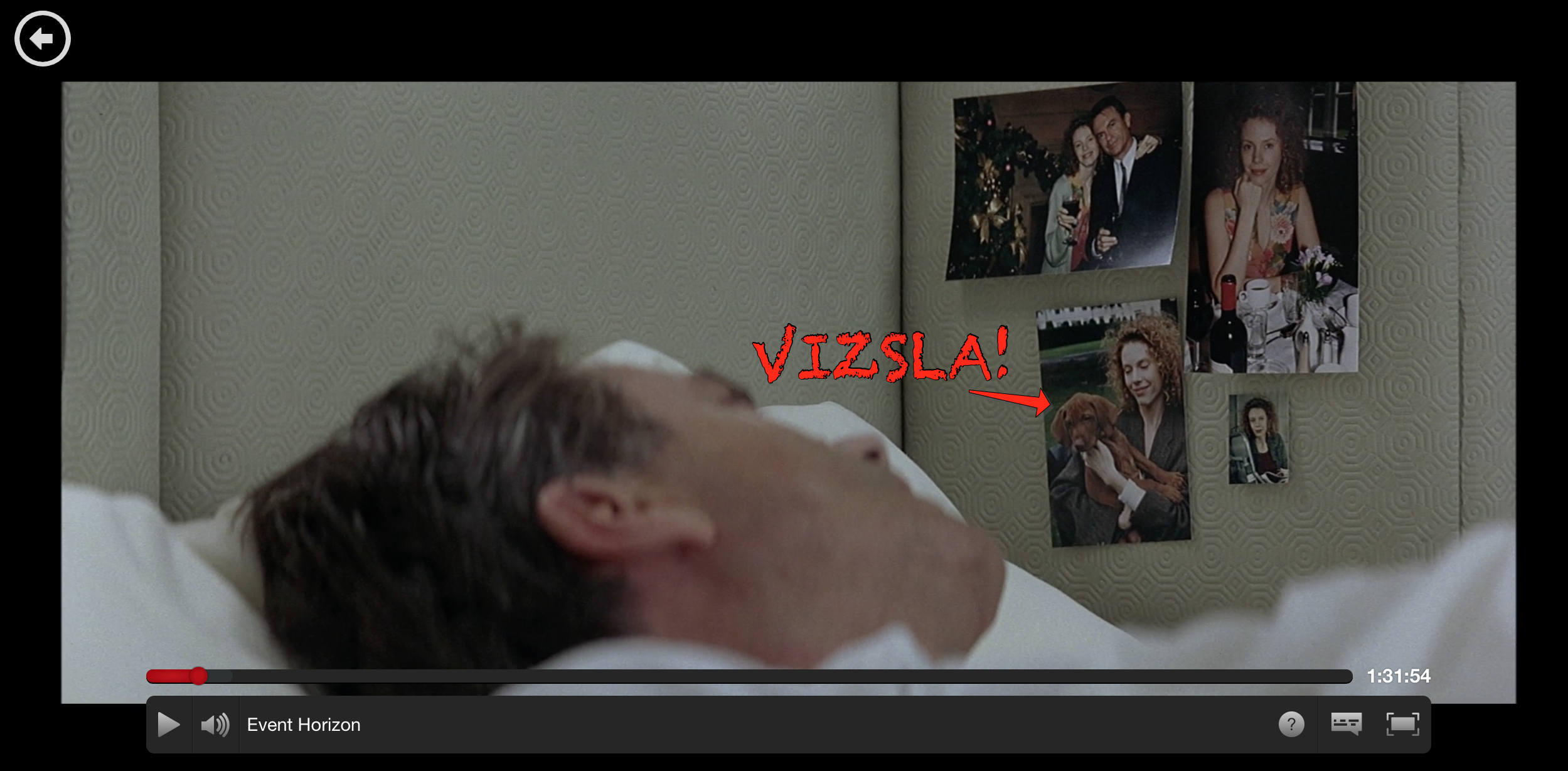 At least he didn’t drag the vizsla into space with him. When vizslas go into space, things never work out quite right. Umm, not that things worked out quite right in “Event Horizon”, either, but you know what I mean. Anyway, if you’re going to take an animal onto a spaceship with you, you’re probably better off bringing a cat.