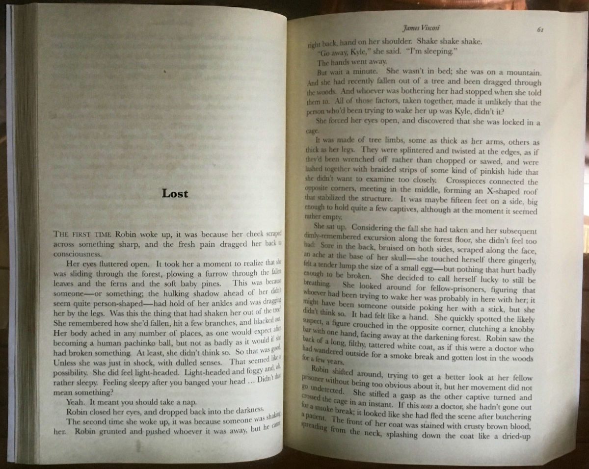 After hearing back from Amazon’s KDP service that they didn’t normalize my margins to 0.5″ (I had set the interior margin, or gutter, to 0.75″ in the upload), I prepared a new interior file for them, this time with an 0.9″ gutter and an 0.35″ outer margin. The above is a picture of a book printed with the new margins, which looks much more acceptable. Getting out the trusty ruler and flattening the book out as much as I can want to, it appears that the gutter is now 0.75″, which is what I wanted originally. My conclusion, based on an admittedly small sample size of three books, is that the KDP printing process is shaving off anywhere from 0.15″ to 0.25″ of the interior margin. I can live with that variation, as long as nobody has to crack the spine to read the first word of each line.
