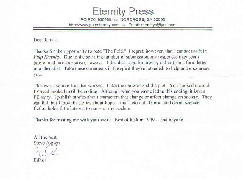 As it’s been a while since I dipped into my trove of rejection letters, this week I turned to random.org, asked them for a letter, and got an “E”. So I reached into the folder and pulled out this nice one, from Pulp Eternity, which is either from the end of 1998 or the beginning of 1999: