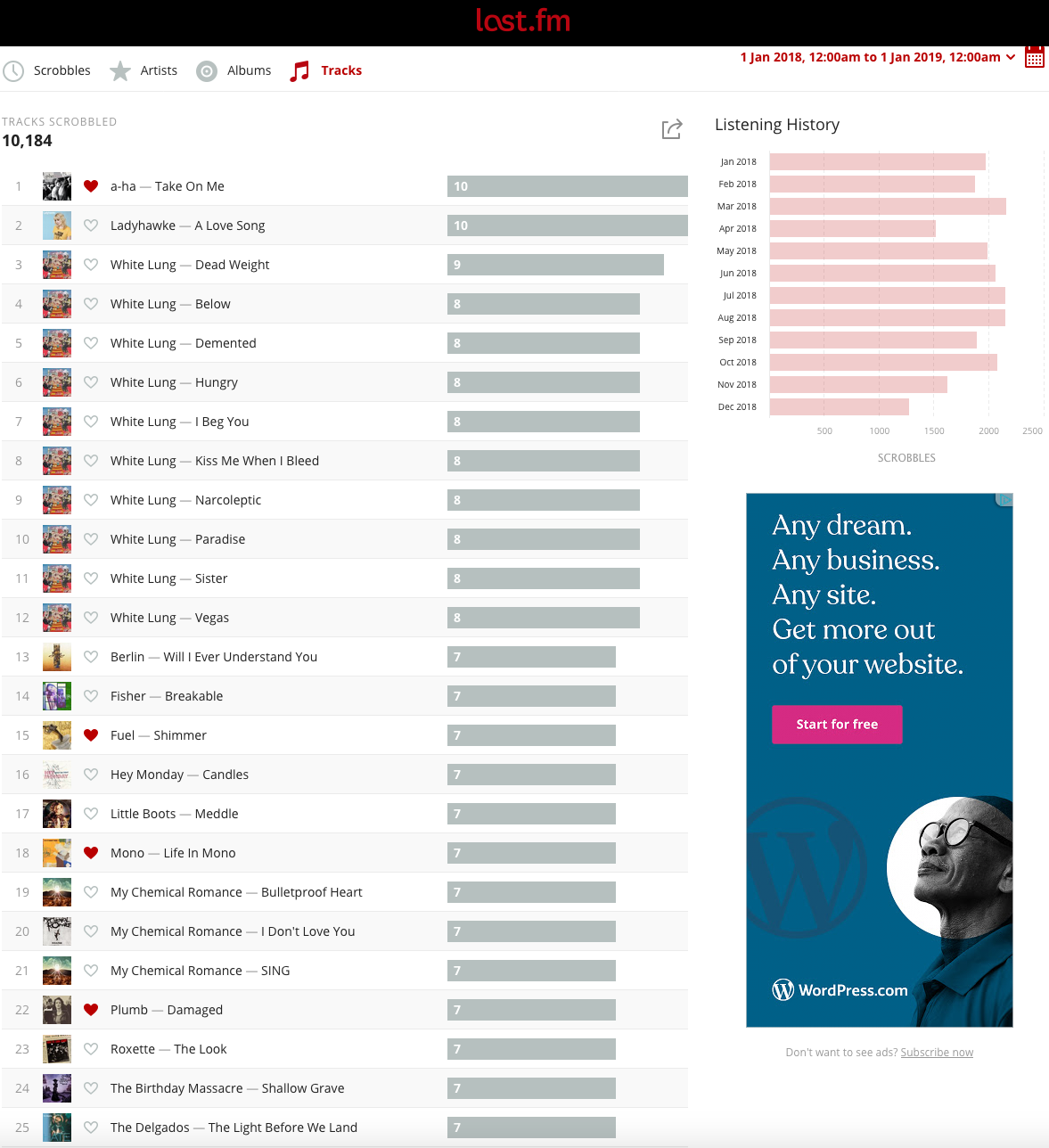 Last week I posted my 2018 reading report from Goodreads; not long after receiving the Goodreads book report, I got a music report from Last.fm, a site which, once upon a time, I used quite a bit for streaming and discovering new music (“Neighbor Radio” was a favorite feature of mine). Sadly, some years ago Last.fm was acquired by CBS, and subsequent feature changes (and by “changes” I mean “deletions”) gradually turned the service into a steaming pile of crap. Maybe that was CBS’s fault*, or maybe it would have gone in that direction anyway, but whatever the reason, nearly everything I once used it for (and I actually subscribed, for a while, paying actual cash dollars) disappeared. No more desktop listening client. No more neighbor radio. No more real web listening client, either; the last few times I tried it, all it did was play crappy versions of songs that it apparently found on YouTube or something. Yet one aspect of its old functionality lingers on: The AudioScrobbler, which keeps an eye on what I listen to, so that Last.fm can make artist suggestions on those occasions when I briefly return to the smoldering wasteland that was once a decent web site. And this year, they sent me a recap of what I listened to in 2018. And even though this is by no means a music blog, I figured I would share their findings.