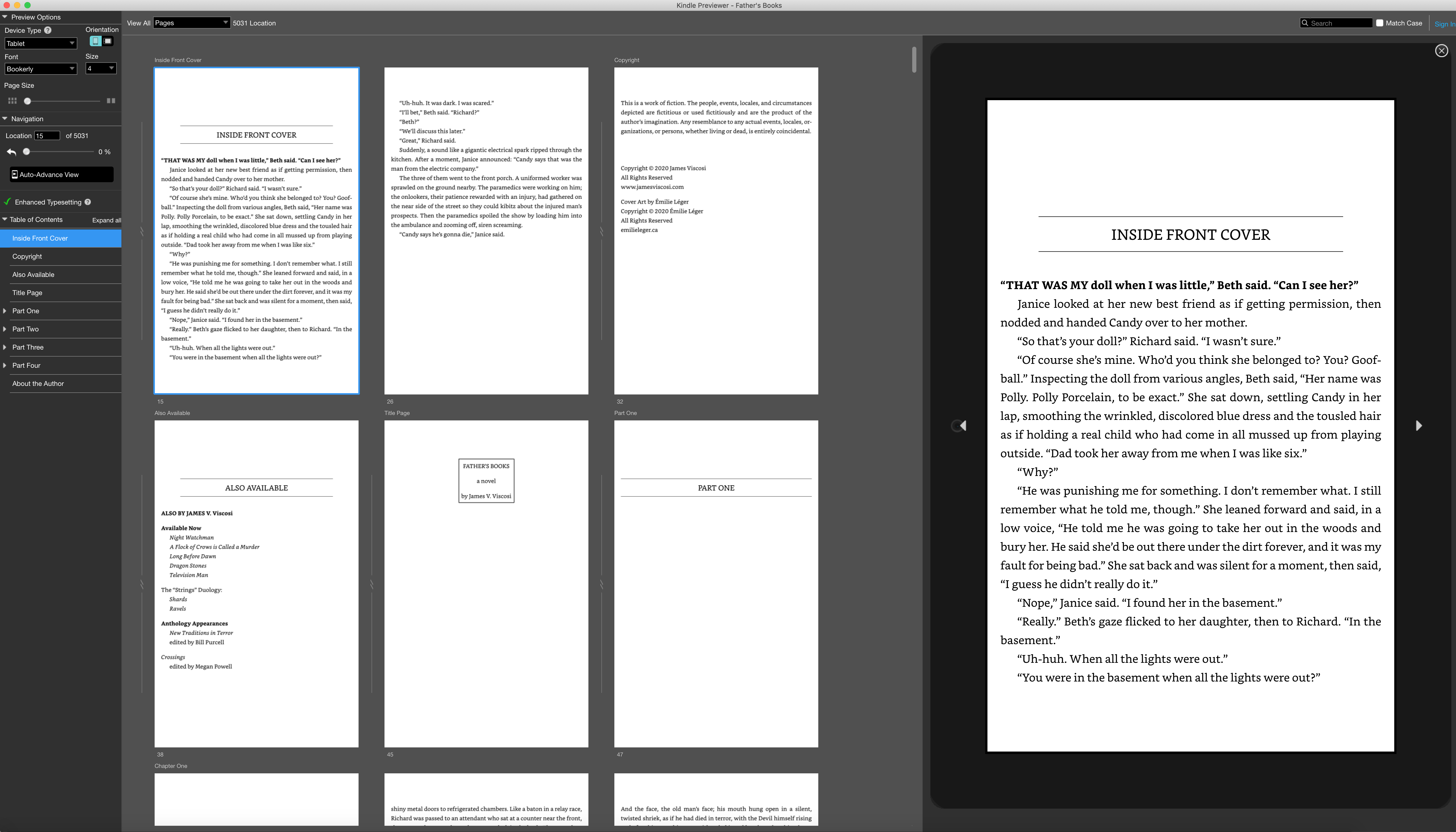 Meanwhile, editing is … finished, yes, finished, on Father’s Books! (If you chose “Because he wants to be able to say editing is finished in the next one” in your local “Why hasn’t Jim posted a Teaser Tuesday in a while?” betting pool, then congratulations! You win … uh, the same thing you would have lost if you’d chosen “Because he has given up reading”.) So now we’re on to the layout and publication phase, which, long-time readers may recall, is harder than it looks. I’m starting with the Kindle edition, since that’s by far where the most books get sold, and the first thing to do is to get the Scrivener file in shape for a proper eBook and Novel export. I still have all my presets saved from the last book, of course, but does that mean everything exported just fine the first time? Or the second time? Or the third time? Pfft. What fun would that be? Here’s what it looks like right now in the Kindle previewer: