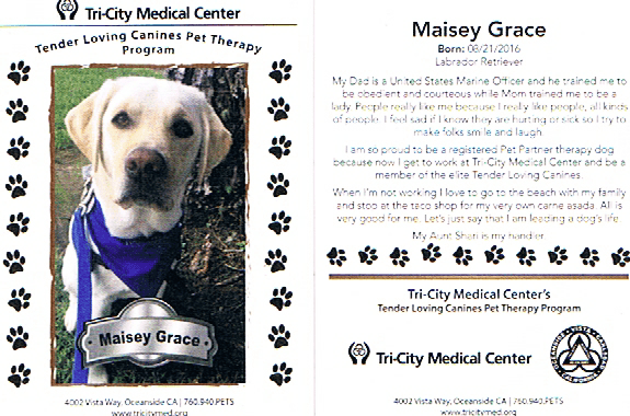 At this point, the reader may be wondering why I’ve just spent so much time writing about a story that’s nearly 20 years old. Well, there are a couple of reasons. One is that, despite the fact that coiling is now a well-established procedure, it’s quite possible that there remain hospitals and practitioners who still automatically fall back to the old standby of clipping even when coiling might be the better option—not all aneurysms can be coiled—and so I thought a little history from distant era of Pets.com and the Y2K bug might someday be of use to a patient or their family member. Another is that it sort of illuminates, once again, just how fortunate I was that my experience happened in a place (the highly-populated Southern California region; much as I dislike crowds, crowds do mean large hospitals and a big pool of medical professionals trained in a wide variety of techniques) and a time (late 2019) that allowed me to be treated via coiling, and to subsequently get very close attention from the ICU nursing staff. If the rupture had happened years earlier, before coiling was widely accepted, when we lived out in the woods in upstate New York, or if it had happened a year later, when Southern California ICUs were filled up with COVID-19 patients and the staff were stretched and stressed to the breaking point, who knows what would have happened? I may not have had nurses keeping such a close eye on me that they could immediately handle the rather rough time I had coming out of anesthesia after the coiling procedure (which, despite the title of that Times article, I’m pretty sure still counts as surgery, though of the minimally-invasive variety) or, less seriously, fetching me emergency copies of Esquire to read; nor would I have had the steady stream of friends and cousins dropping by to cheer me up and help my wife out. Also, the pet therapy program would have been shut down, so during my stay I wouldn’t have gotten a visit from this sweet girl, whose business card I still retain: