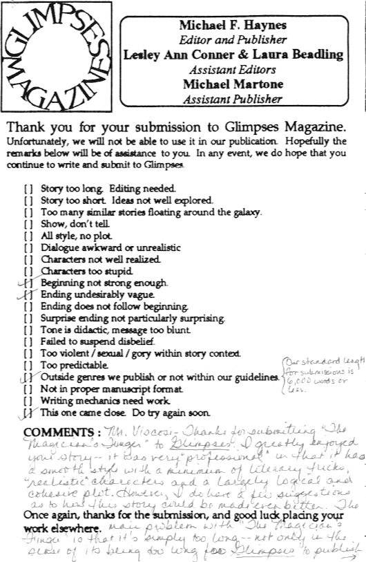 So this week I fired up good old Random.org and had it pick a letter of the alphabet and a position, and thus I reached into my vast trove of rejection (and a few acceptance) letters and pulled out this little gem, from when I submitted a story called “The Magician’s Finger” to a magazine called Glimpses: