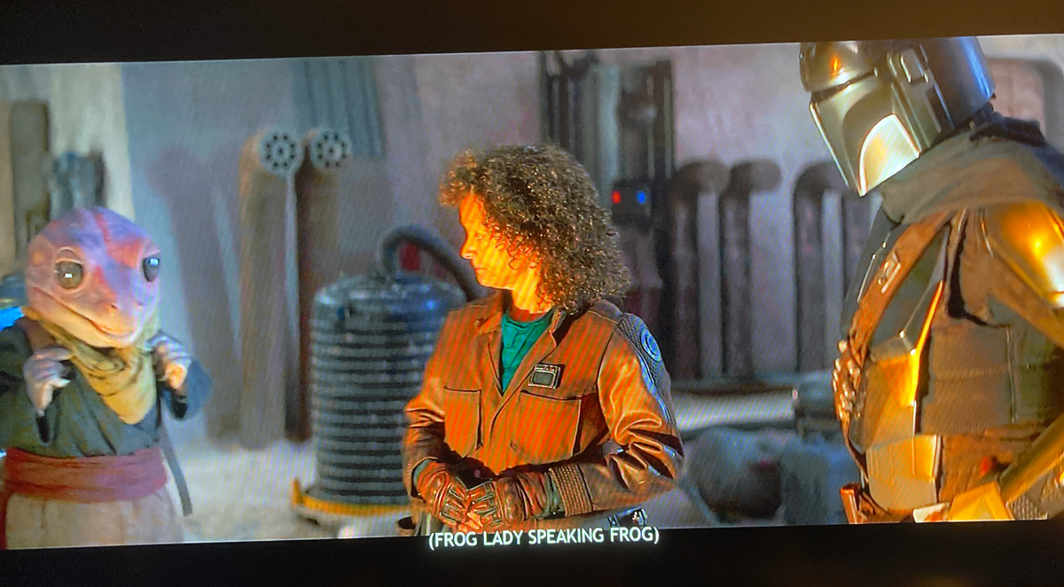 Does it say “Gering-ding-ding-ding-dingeringeding”? No, that’s what the fox says, apparently. The frog mostly says things that nobody can understand. But at least the subtitles are there to clarify things, so we can definitively answer this question. What does the frog say when she meets the Mandalorian? She speaks frog.