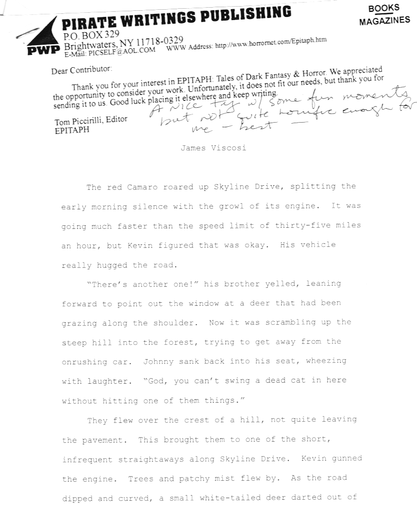 So this week I reached into my vast trove of rejection letters, as directed by the Gods of Randomness, and pulled out this short rejection, from the old magazine Epitaph, a division of Pirate Writings: