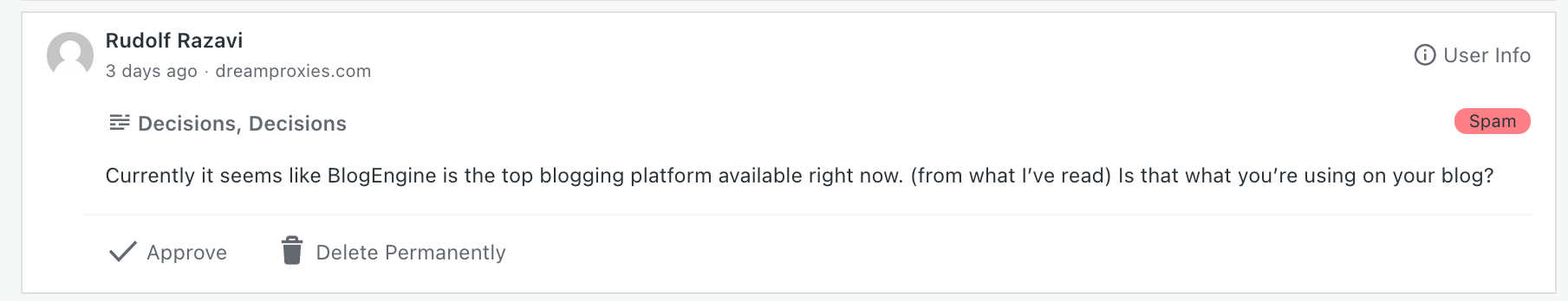Tune in next week for more examples of the sort of stuff that one has to wade through when doing bulk-deletion of spam comments, when the category will be one that’s closely related to Seeking Fake Advice Spam: Fake Technical Support Request Spam!