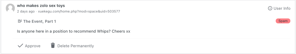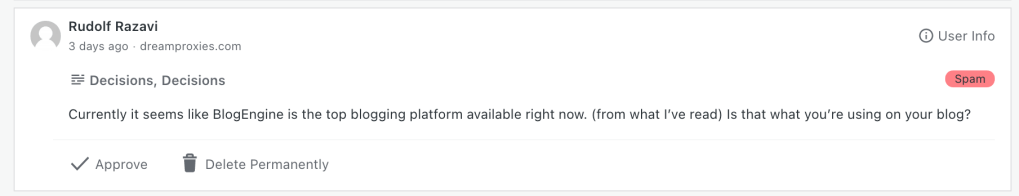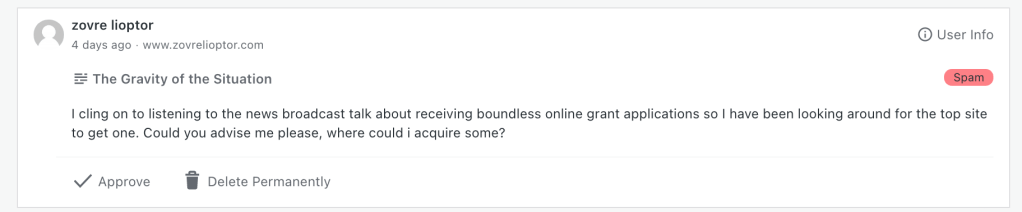 So one of the regular housekeeping chores involved with running a blog is of course reviewing spam comments. I mean, you don’t have to do it; you can just ignore your spam comments, and let them be fully managed and deleted automatically by your anti-spam plugin. (And you do need an anti-spam plugin. Oh boy do you need an anti-spam plugin.) But if you never review the comments on your spam list, you will miss the (very) occasional real comment that gets caught up in the dragnet, and you don’t really want to leave someone twisting in the wind after they took the time to write a comment, do you?