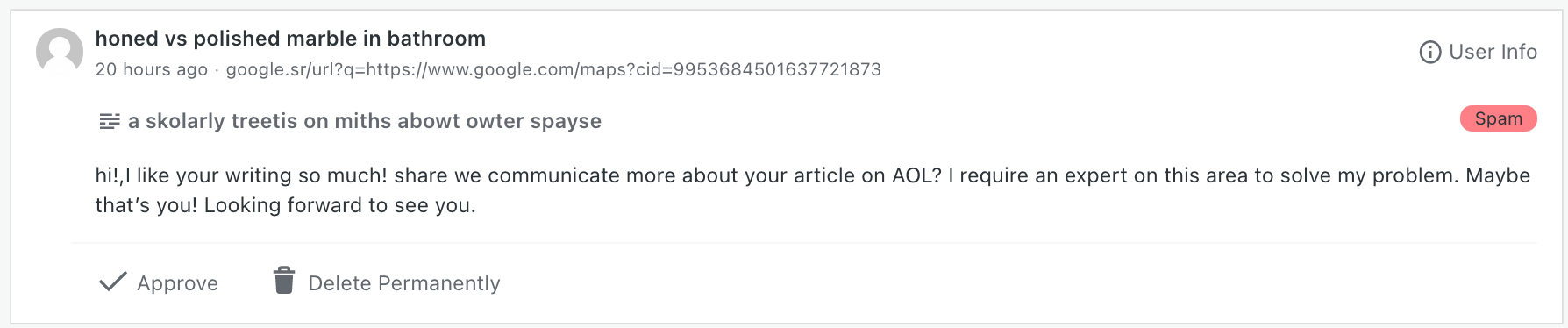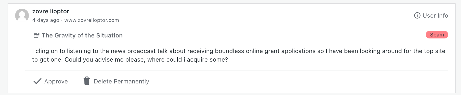 Anyway, this isn’t really a post about blog spam maintenance; it’s about the blog spam itself, in which, over the course of time, one begins to find patterns. It doesn’t take long, because spammers use bots, and bots are by their nature not exactly imaginative. You see the same things over and over and over again, which at first is tedious, then becomes sort of amusing, then becomes tedious again, until, eventually, you’re like, Hey, maybe I can get some blog posts out of this. Because blog post topics don’t grow on trees, but spam sure does. So for the next few weeks let’s look at some broad categories and concrete examples of spam comments, to wit, this week’s category:
