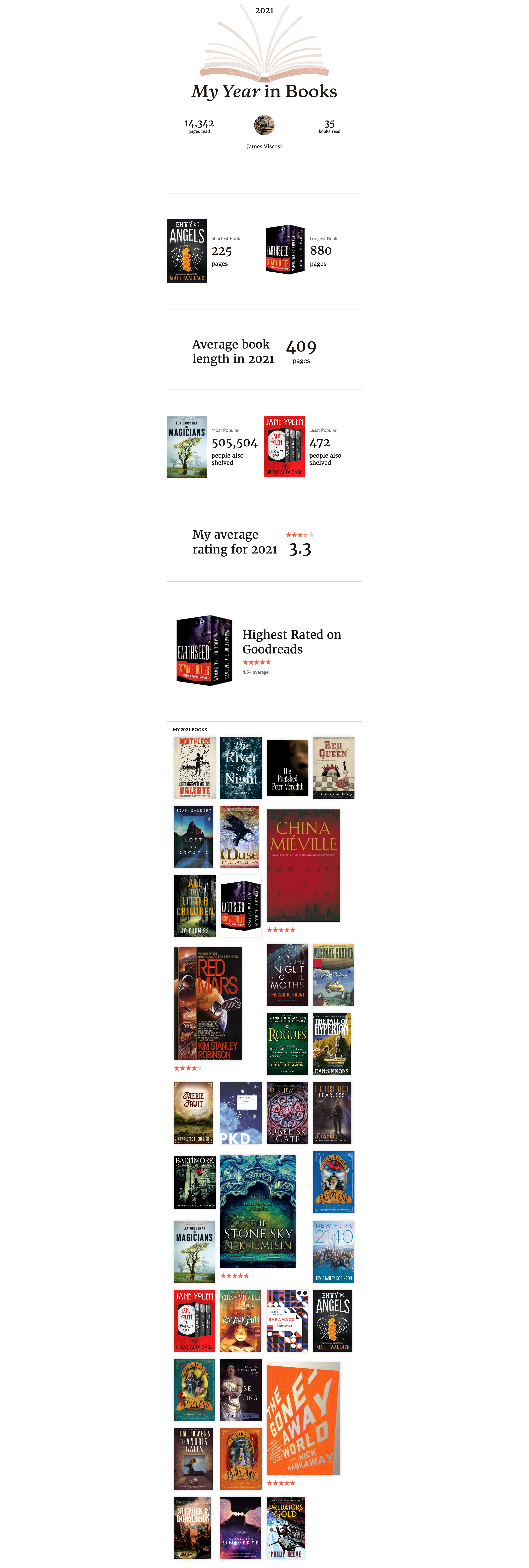 - I didn’t read as much in 2021 as I did in 2020; I’m down nearly 4,000 pages, from just over 18,000 to 14,342, and the number of books is down from 45 to 35. I’m thinking this may be because I bailed out on more books in 2020 than I did in 2021 (a theory supported by 2020’s lower average rating); Goodreads doesn’t have a built-in DNF shelf, meaning you have to roll your own—mine is called “Failed to Finish”—and while it’s possible, I think, to remove a book from the built-in “Currently Reading” shelf back to the no shelf at all, I don’t do that with a DNF, I move it to “Read”, which means it still counts against my end-of-year summary. Let’s go do the math! Let’s see, from counting my shelved books, I put six books on DNF this year, vs. nine in 2020. I DNF’d twelve in 2019, four in 2018, and nary a single one in 2017. Guess that was a good year for books. (For those who are keeping track, I read 53 books in 2019, 47 in 2018, and 41 in 2017.)