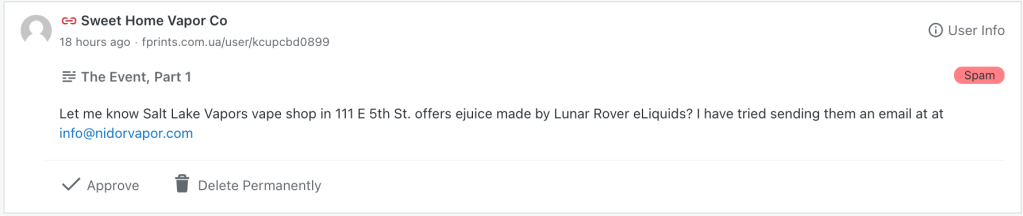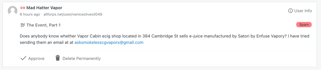 Just for fun, I decided to look up these vape shops, and stores with those names do actually exist, although not on the specified streets, so I’m going to have to say that the answer to both questions would be “no”. The vape manufacturers exist as well. So who’s paying for this particular spam? The vape shops that aren’t where the spam says they are? The companies making the stuff you put in the vape? Both? Communists? Hostile artificial intelligences? Well, to quote a venerable purveyor of a different sort of addictive substance marketed to younger folks:
