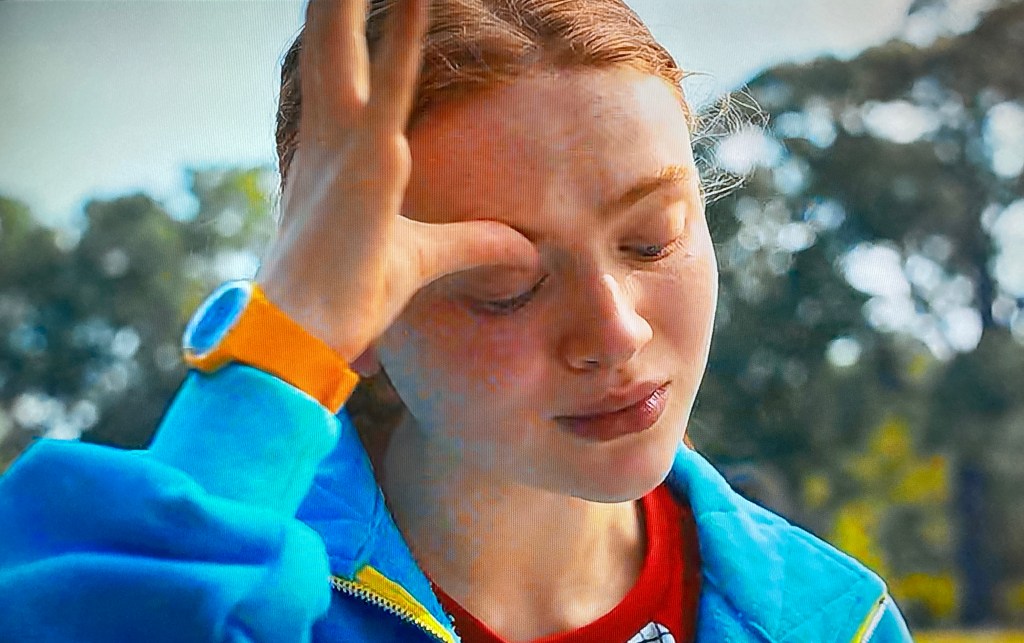 No no, I’m kidding*, that isn’t really a major plot development**. No, the major plot development is that the season’s Big Bad (probably), Vecna, makes his move on Max ― she of the orange watch! ― by bamfing her consciousness into his Upside-Down hellscape and preparing to do that really gross thing he does where he levitates his victim up in the air, snaps all their joints like twigs (including their jaws!), and then pulls their eyes into their heads leaving only empty sockets behind, before finally killing them. So that’s a nice way to go.***
