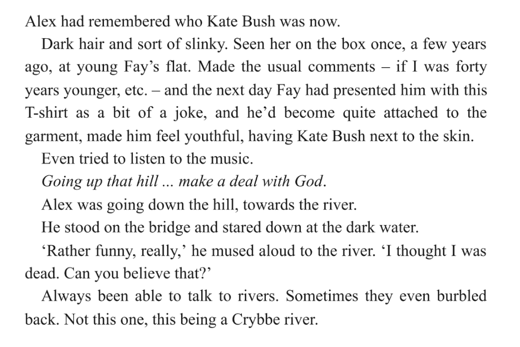 Right there with you, with the Kate Bush/Crybbe connection. Maybe one of my favorite novels, and due for a reread now.
