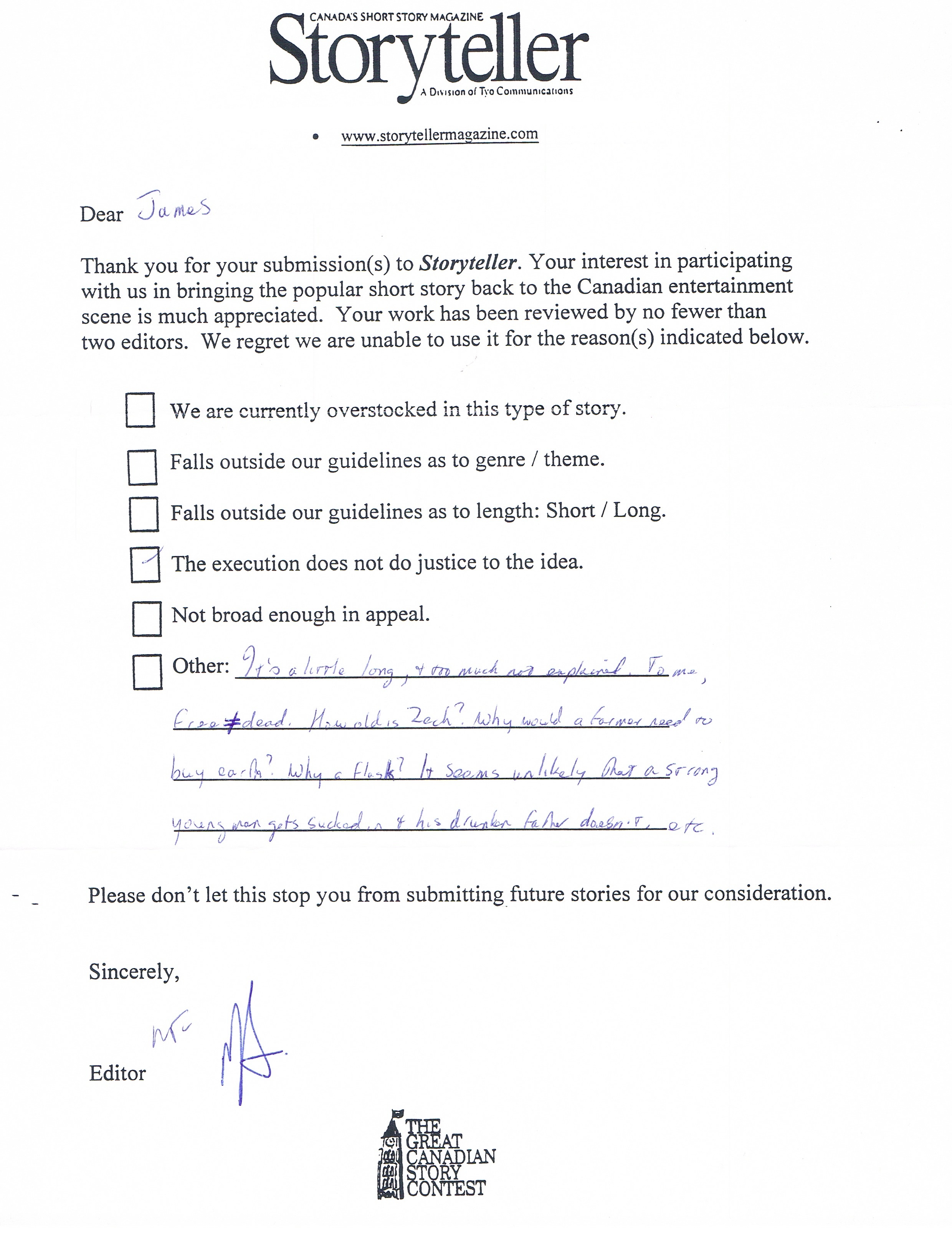 On this occasion, the Gods of Randomness told me I should look in the “S” folder of my expandable file, which, as you can imagine based on the prevalence of “S” in the English language is one of the more well-populated ones. And what should I find on top in that section but two letters from the Canadian magazine Storyteller, of which one was, as expected, a rejection, but the other was one of those rarer beasts, an acceptance. So in the interest of inducing a little mood whiplash, I scanned them both. First, let’s do the rejection: