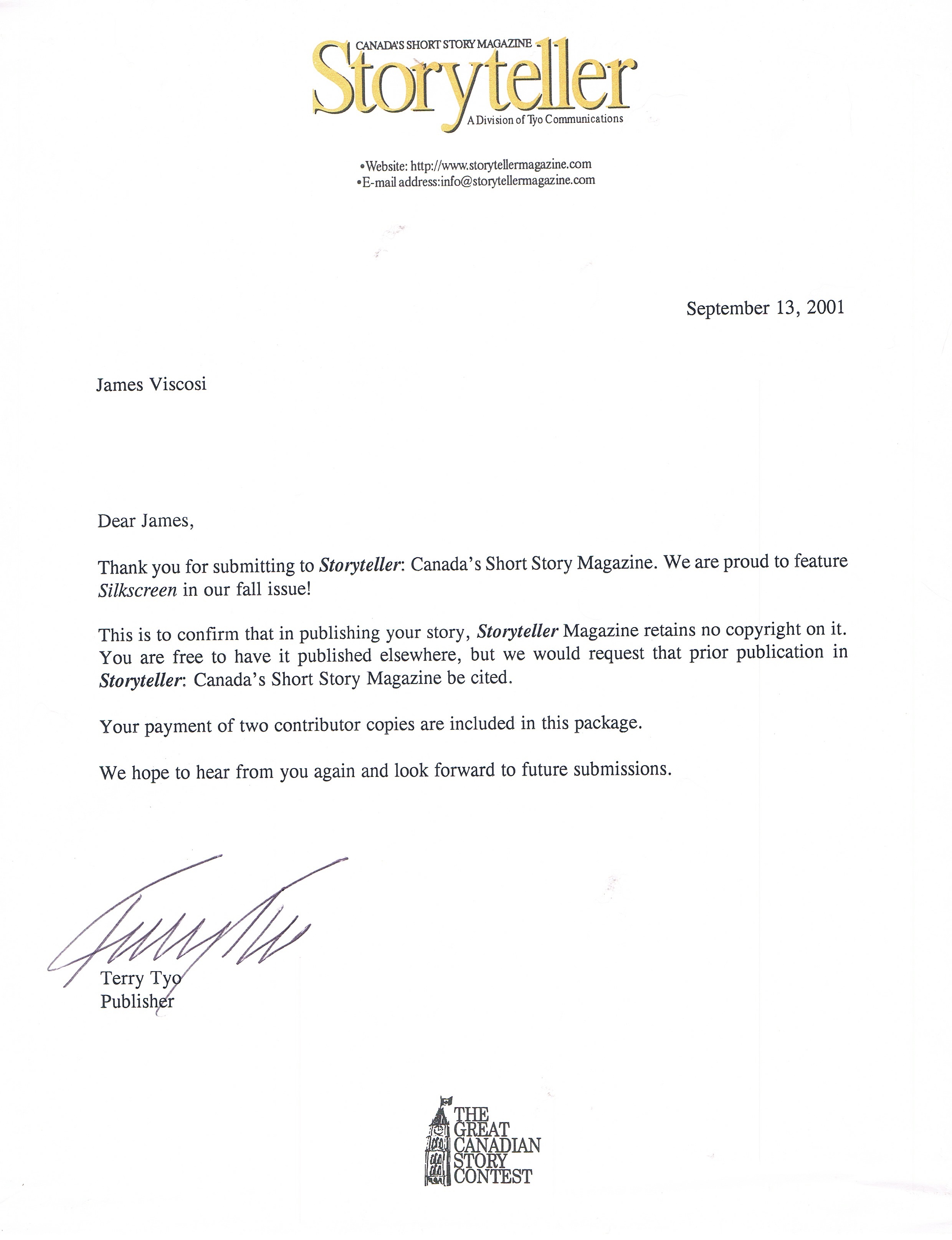 Next up, we have the acceptance from “Storyteller”, which is for a short story called “Silkscreen”: