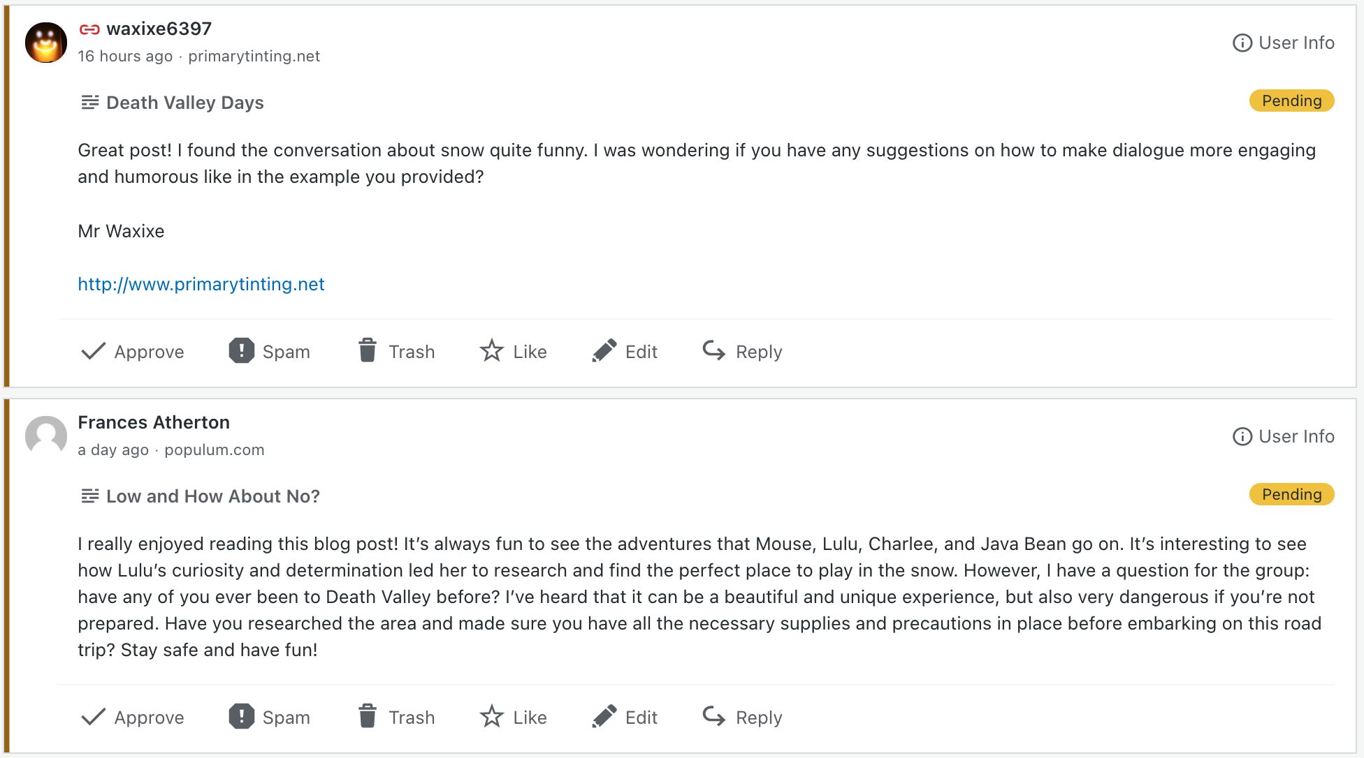 Both of the posts in question involved Lulu’s—who, for those not familiar with the animals, is a malamute/husky mix—attempting to find some low-altitude snow to play in after all the recent storms in our area*****. Once again both comments are superficially relevant to the posts, in that they both understand that the posts reference snow, and the second one even understands that Lulu is trying to find snow, although she never found it. (The second comment has a few other giveaways that it isn’t real. For instance, the mouse didn’t go on this particular adventure; in fact, he tried to dissuade the others from going. Also, nobody on the blog ever calls the mouse “Mouse”, which is not his name******; he’s always “the mouse”.) None of these three comments displays any actual comprehension, and all follow the same structure of a generic comment offering some manner of praise, followed by a question which is clearly an automated attempt to attract engagement.