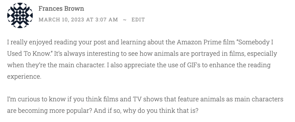I really enjoyed reading your post and learning about the Amazon Prime film “Somebody I Used To Know.” It’s always interesting to see how animals are portrayed in films, especially when they’re the main character. I also appreciate the use of GIFs to enhance the reading experience.