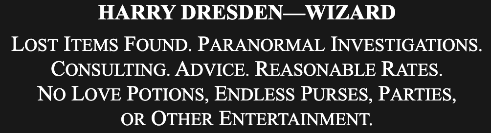 Now, the premise of The Dresden Files is, basically, that Harry Dresden is a wizard in Chicago who is also a private investigator and occasional police consultant. What does he investigate? Well, just let me show you his ad in the yellow pages.