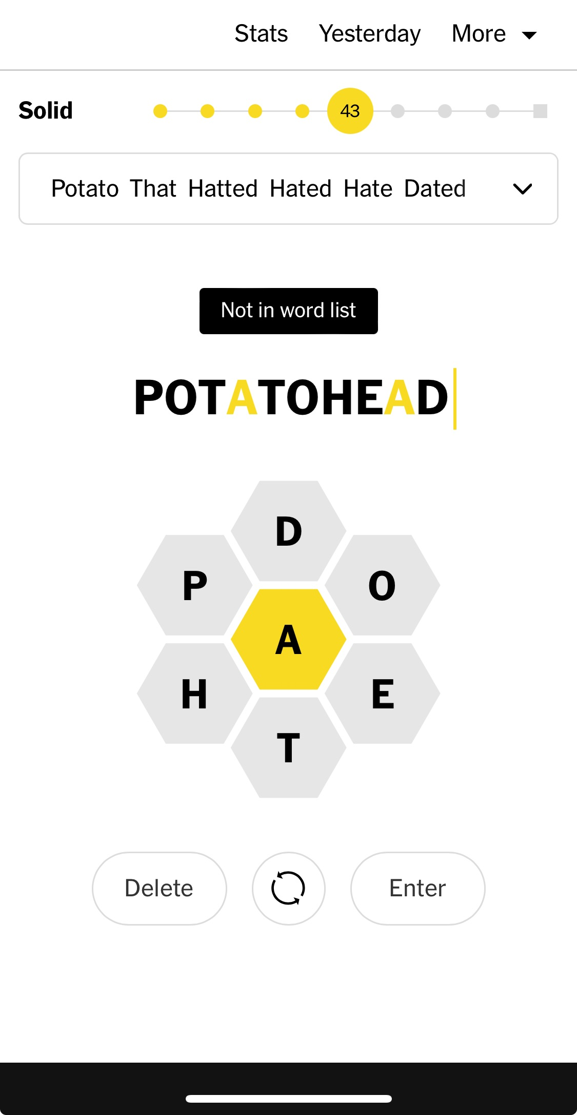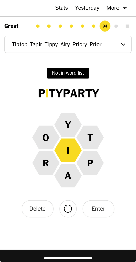 • The list of words doesn’t include every word you could possibly make with those seven letters; the list is “curated” to exclude some less common or more specialized words. This may seem arbitrary, but after playing it for a while, you kind of know what words aren’t going to be there*. At one point I found a web site with a Spelling Bee clone that does include every possible word for the seven letters, and man, that’s too many words.**