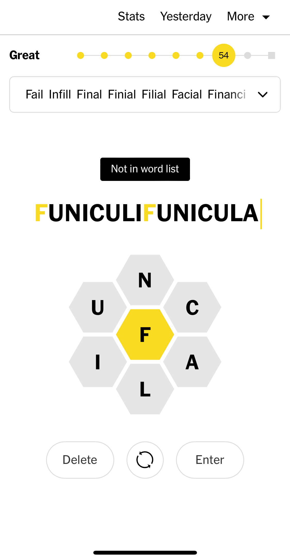 Anyway, that’s all just background. The real purpose of this post is that it’s fun to use Spelling Bee to spell words that don’t exist, for instance: