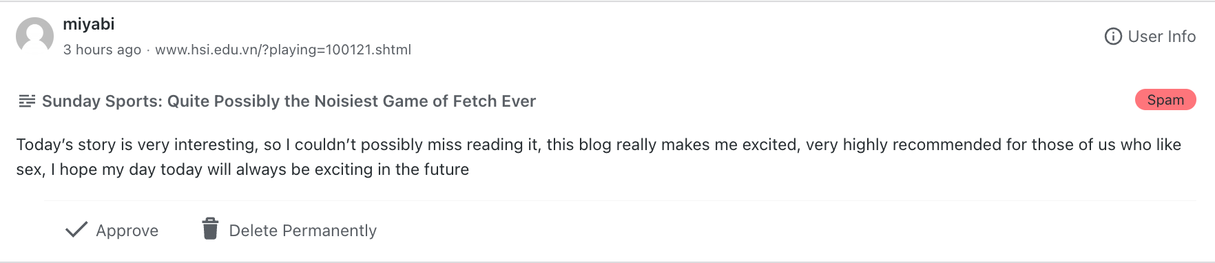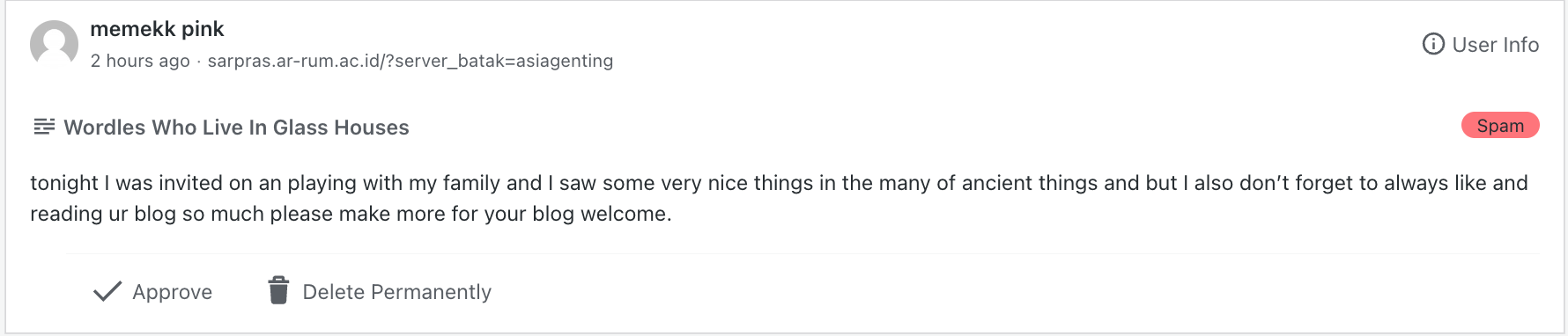 So at first, we were getting all kinds of random spam at the blogs; then for a while we were getting AI spam, where something that seemed very much like an LLM would leave comments that were clearly spam, yet also were clearly in response to the post to which they were attached. After that, for some reason, we entered a joyful period of very little spam, a Pax Spamana if you will. And what have we got now? Well, now we have dozens of spam comments that are clearly being assembled out of random constituents, making them mostly gibberish, yet also, weirdly poetic, almost haiku-ish. Let’s take a look: