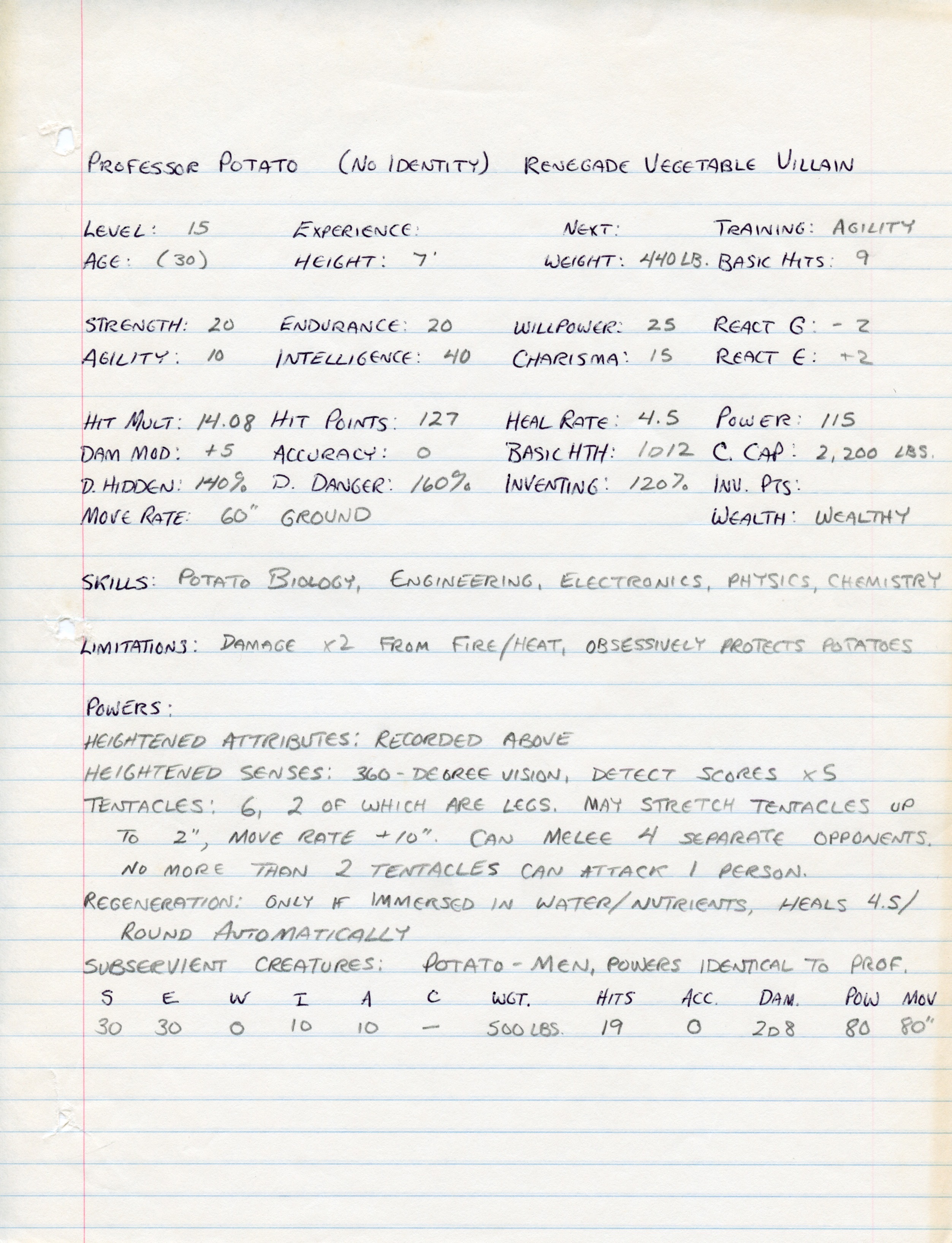 He’s also got tentacles that he can extend up to 2″, because apparently he’s been left in the drawer for too long and has started to sprout. Now, I know that two inches doesn’t sound like a lot, but that’s two inches on the V&V map, which is probably like 20 feet; I don’t remember exactly, but that seems about right. One can just imagine the cover of the comic book in which Professor Potato is engaging, say, the Fantastic Four, and is engaging Reed Richards in the Battle of the Extendable Limbs and avoiding getting roasted by The Human Torch while his Potato-Men minions are keeping The Thing (who kinda looks like he’s made out of tater tots, now that I think about it) and Sue Storm occupied. Not that Marvel would ever do something so ridicu—