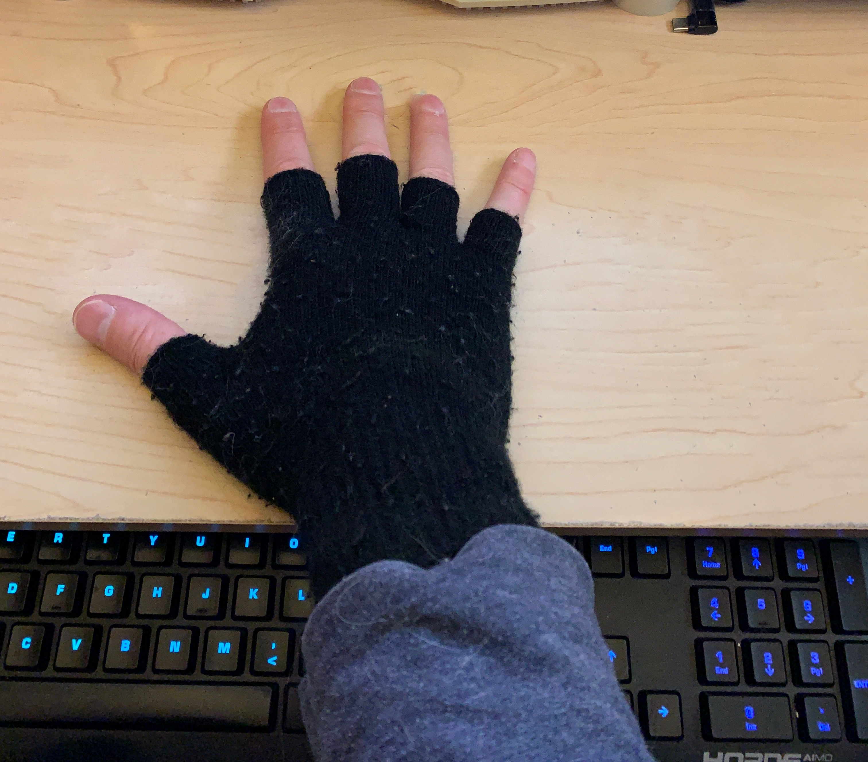 Anyway, the solution, aside from turning the heat up a little, was to pick up some knit gloves that cover the hands but not the fingers: