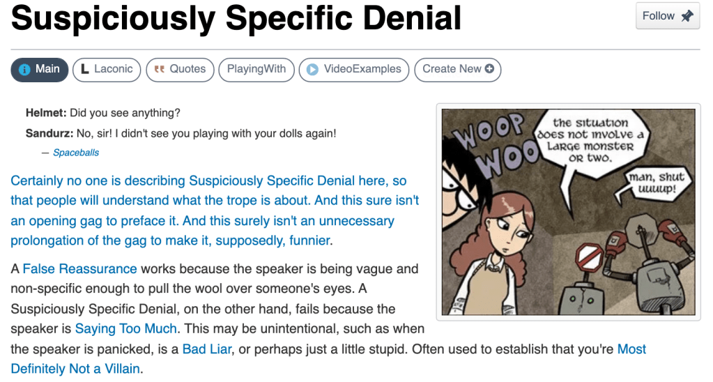 Those who frequent the excellently time-wasting site TV Tropes may be familiar with the trope “Suspiciously Specific Denial“: